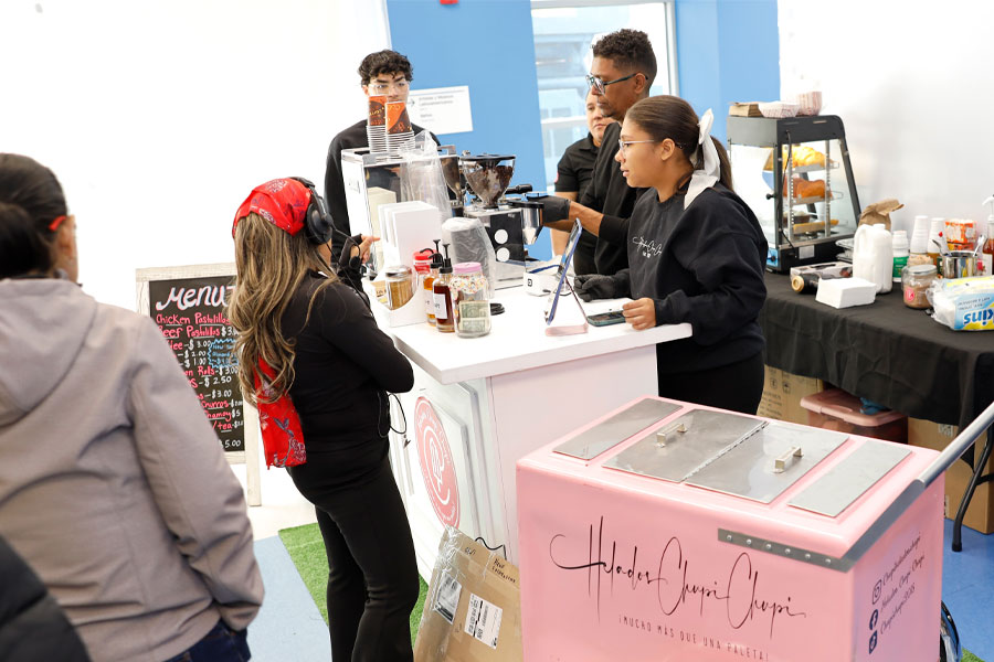 (I–D) Alberto López Herrera, director de Educación en las Artes y cofundador de Calpulli; Christopher Cortez e Isabella Vergara, bailarines de Calpulli; Bill Rhoads, vicepresidente senior de Esperanza Arts Center; Criis Vega y Cindy García, bailarines de Calpulli y Juan Castaño, director ejecutivo y cofundador de Calpulli (Foto: José Somalo)