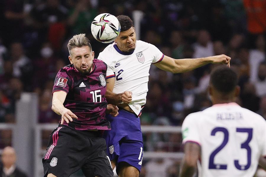 Héctor Herrera (i), de México, fue registrado este jueves al disputar un balón con Miles Robinson de Estados Unidos, durante un partido de las eliminatorias de la Concacaf al Mundial FIFA de Catar 2022, em el estadio Azteca, en Ciudad de México (México). (Foto: EFE/José Méndez)