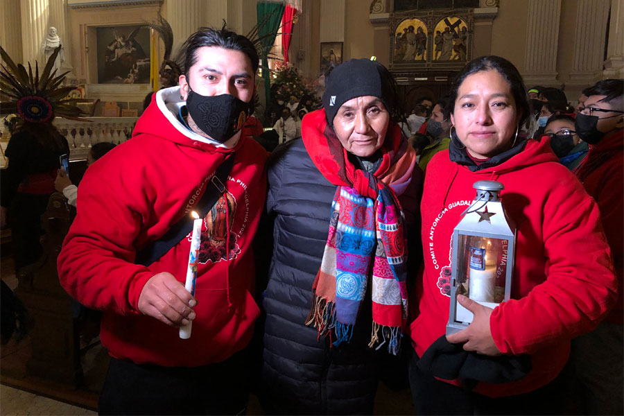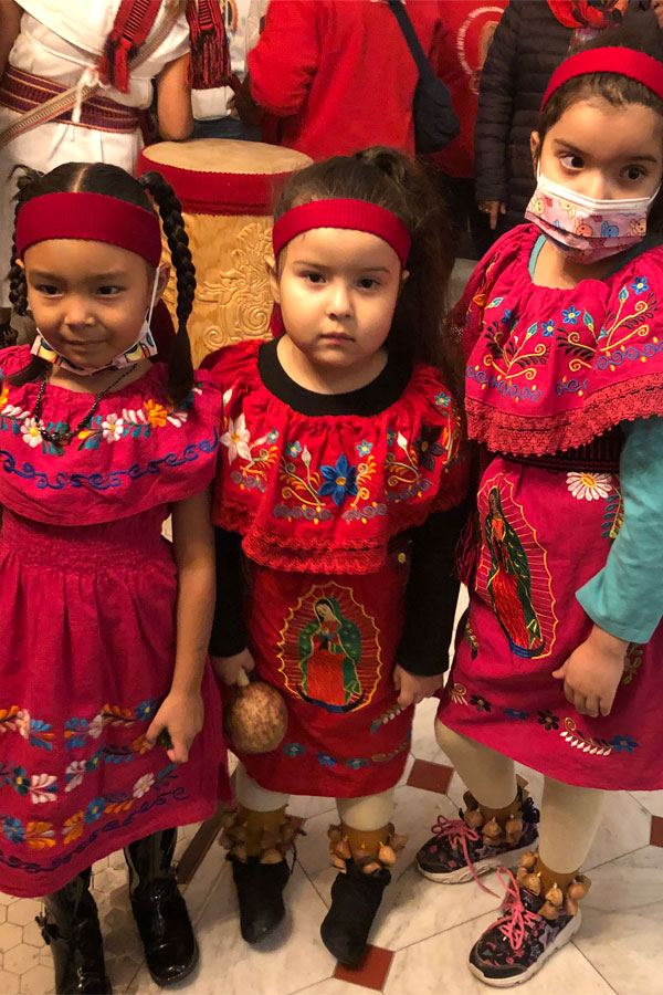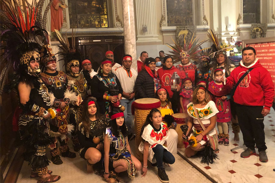 Las imágenes de la Virgen de Guadalupe y de San Juan Diego fueron colocadas en el altar mayor para ser recibidos con danza azteca por los grupos Tonantzin Yaotecas de Delaware, Tonantzin Cloatlicue de New Jersey, y danzantes de Filadelfia. Entre ellos nos llamó la atención la presencia de las tres niñas Avila, de entre 5 y 7 años, que al igual que los adultos bailaron para la Virgen.