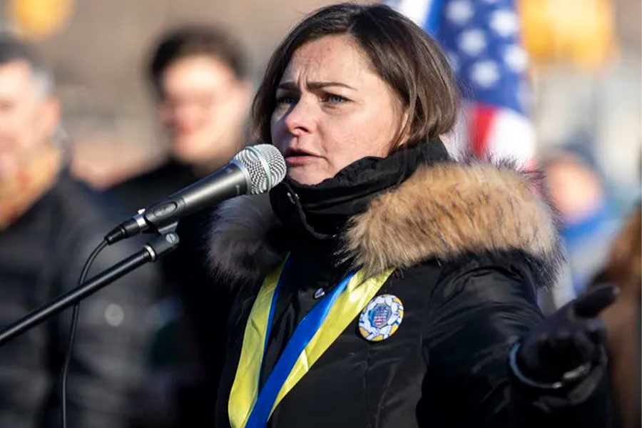 Iryna Mazur, la cónsul honoraria local de Ucrania, habló mientras la comunidad ucraniana local y sus partidarios se reunían para una manifestación en los escalones del Museo de Arte en Filadelfia, Pensilvania, el domingo 30 de enero de 2022. El grupo se unió en apoyo de Ucrania en medio de lo que entonces eran tensiones, no luchando, por una amenaza de invasión rusa. (Foto: MONICA HERNDON/ Cortesía del Inquirer)