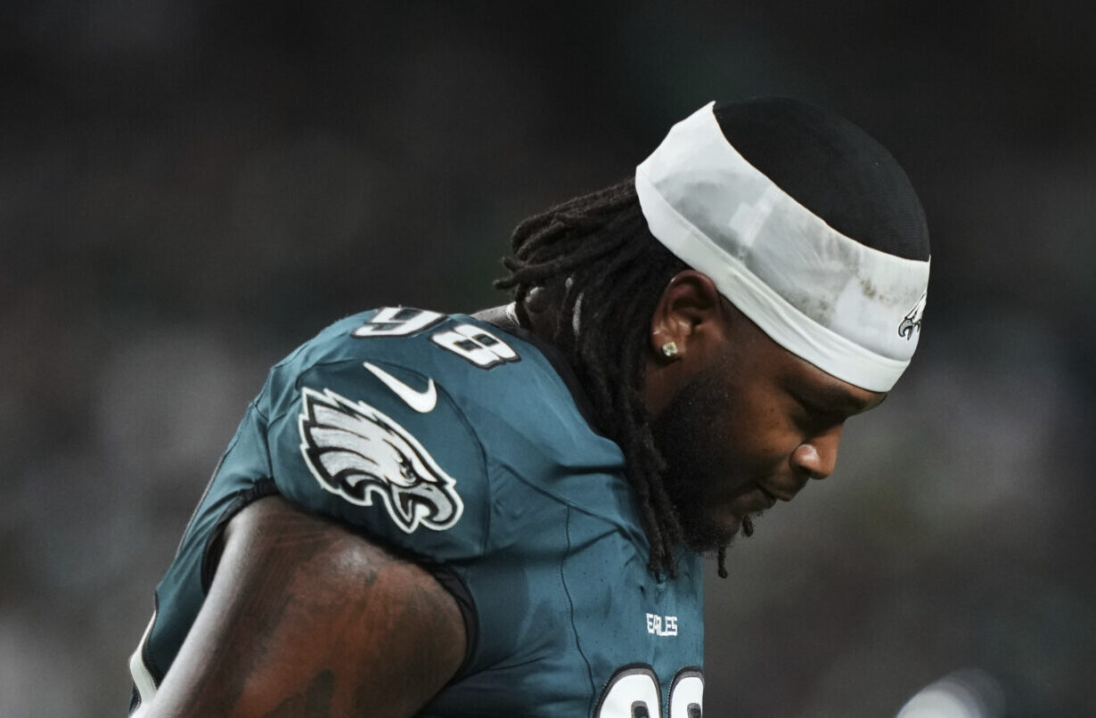 El tacle defensivo de los Eagles de Filadelfia, Jalen Carter, sale del campo tras ser descalificado por conducta antideportiva antes de un juego de fútbol americano de la NFL contra los Cowboys de Dallas, el jueves 4 de septiembre de 2025, en Filadelfia. (AP Photo/Matt Slocum)