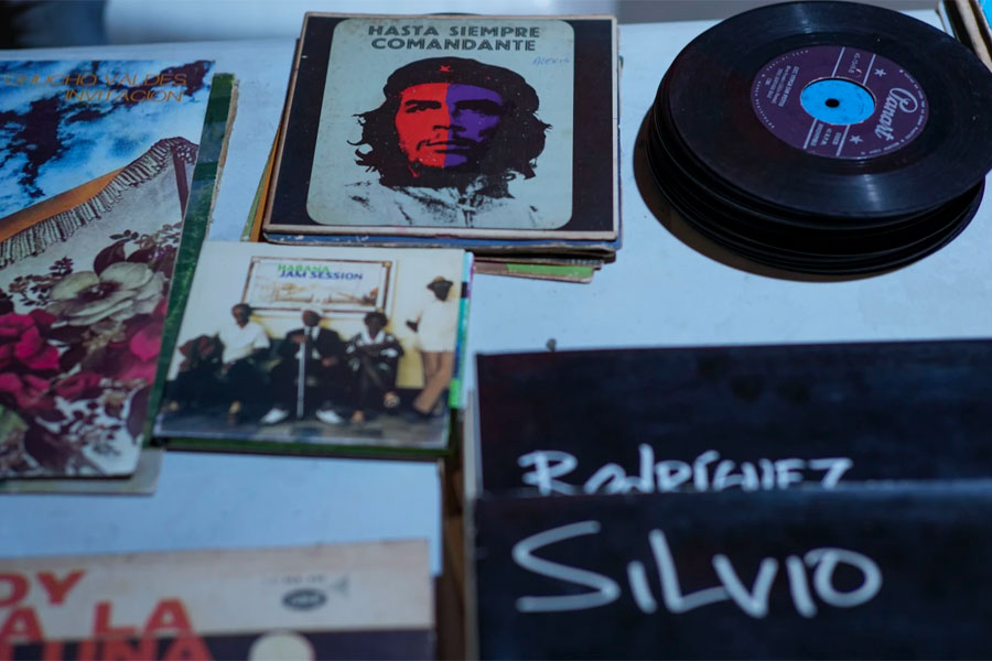 Su tarima estaba tapada de pilas de discos de vinilo, allí convivían: La Sonora Matancera, Celia Cruz, La Charanga Habanera, aquellos primeros discos de Silvio Rodríguez y Pablo Milanés o compilados del Benny Moré, Alberto Ruiz y su conjunto o Joseíto González con su Rumbavana.