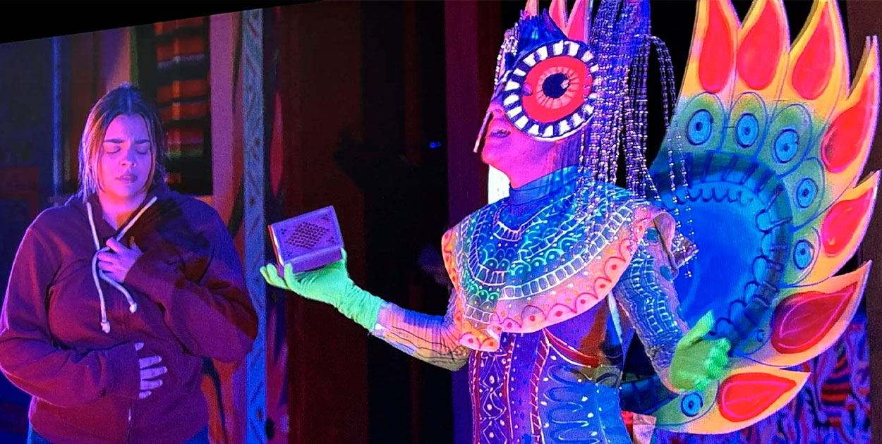 Los asistentes trascienden en el tiempo. La lengua indígena náhuatl resuena en el aire, y el inicio de la obra Quetzalcóatl: The Sun Has Hidden conjura la magia y la sabiduría de una cultura preservada a través de los siglos. En el escenario, la figura imponente de Quetzalcóatl, cubierto en plumas verdes, encarna la dignidad y la fuerza de un pueblo vivo. A lo lejos, se escucha la traducción al español del monólogo, que rememora tiempos de mestizaje, opresión y resiliencia; también se escucha, casi a la par, una voz extranjera que susurra, integrando el lenguaje de una nueva tierra con las raíces profundas de la antigua.
