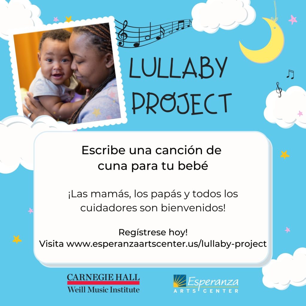 Este año, “Carnegie Hall” está colaborando con Esperanza para traer el Proyecto Lullaby a nuestro vecindario de ¡Hunting Park! El proyecto apoya la salud materna, fortalece el vínculo entre padres y sus hijos, y da a las familias Latinas una oportunidad para desarrollar su propia música, además de un legado cultural. El Teatro de Esperanza manejará el proyecto, y estará distribuyendo información durante las siguientes semanas, a cerca de cómo aplicar para participar. Estarán buscando familias elegibles quienes deseen unirse para componer y grabar su propia canción de cuna.