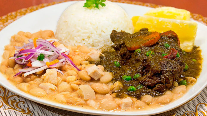 Platillo típico peruano “combinado de seco de cabrito, frejoles y arroz”. (Foto: YouTube)