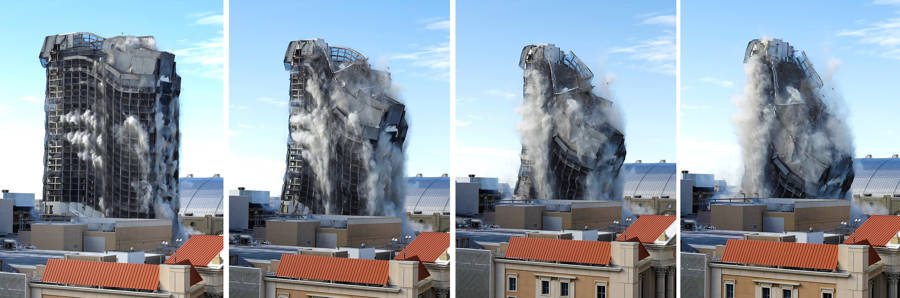 El jefe de bomberos de la ciudad, Scott Evans, ha explicado que se colocaron cargas explosivas en lugares estratégicos de la estructura que lo sustentaba, para que el peso lo hiciera caer sobre su base de manera vertical, con una pequeña desviación hacia el noreste.