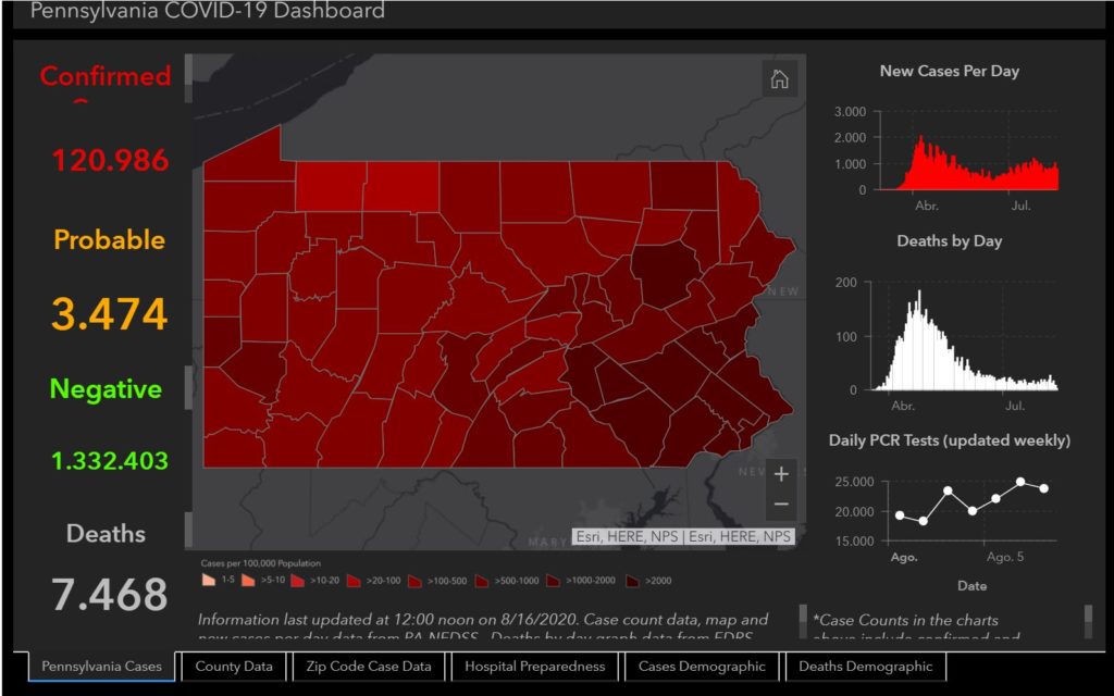 Harrisburg, PA – El Departamento de Salud de Pensilvania confirmó hoy a las 12:00 am del 16 de agosto que hay 660 casos positivos adicionales de COVID-19, lo que eleva el total estatal a 124,460. Los 67 condados de Pensilvania tienen casos de COVID-19.
