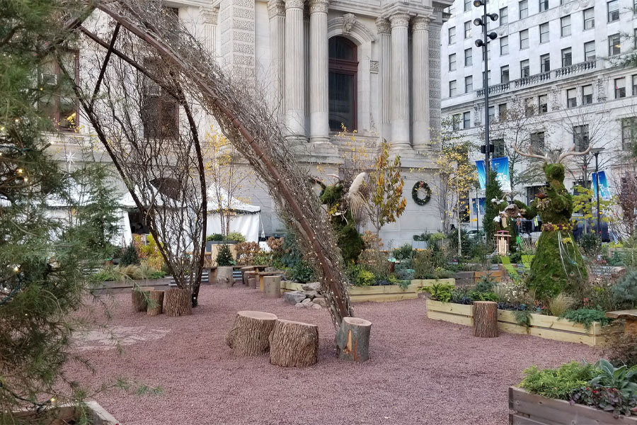 Después de estas inspiradoras historias, empecé a caminar y llegué a Dilworth Park. Me llamó mucho la atención el jardín de invierno. Observé los animales inanimados que se habían construido con elementos de la misma naturaleza. Me preguntaba: ¿cuál es la historia que el artista quiere transmitir? Cómo descifrando un rompecabezas, me puse a observar los elementos de esta composición. Mi imaginación empezó a volar y a crear historias cortas con este tipo de parque zoológico, pero sin rejas. En este ambiente se podía apreciar y sentir una especie de libertad compartida con la naturaleza.