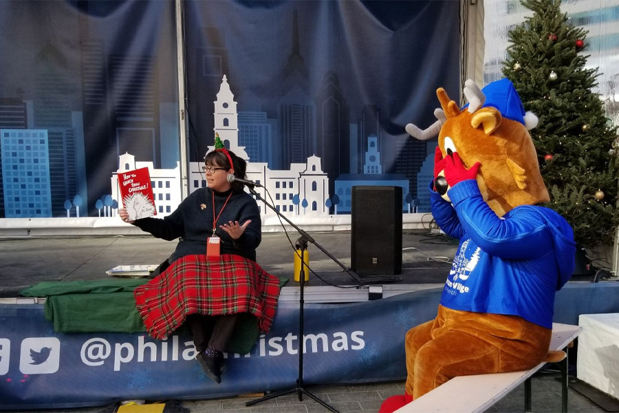 Cruzando la calle Broad, me encuentro con el Christmas Village en Love Park. Al caminar hacia el centro de esta villa veo que una bibliotecaria estaba leyendo cuentos e historias a los transeúntes que circulaban en ese momento. El centro estaba lleno de niños, jóvenes y adultos; todos muy atentos a las historias. Me senté y escuché el cuento de “Cómo el Grinch robó la Navidad/How the Grinch Stole Christmas”. ¿No sé si ustedes han escuchado esta historia? A mí me gusta escucharla porque a pesar de que el Grinch tiene su corazón, tres veces más pequeño que los demás y “odiaba la Navidad”, él aprenderá una lección de vida con el desarrollo de la historia.