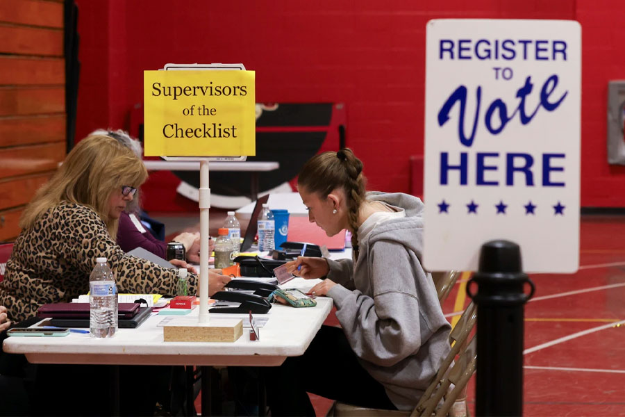 Supervisor of the Checklist for the State of New Hampshire Leslie Dombroski, left, registers Elise Collins, 18, to vote in Derry, N.H., Tuesday, March 11, 2025. (Photo: AP/Reba Saldanha)