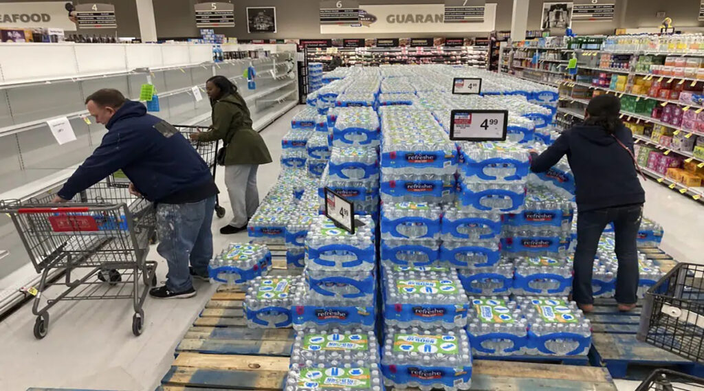 Los anuncios y una alerta enviados el domingo fueron seguidos por una corrida de agua embotellada en las tiendas de Filadelfia que dejó muchos estantes vacíos y carteles de «No hay agua» en algunos. Si no se disponía de agua embotellada, dijeron las autoridades, la gente podía llenar botellas vacías con agua del grifo.