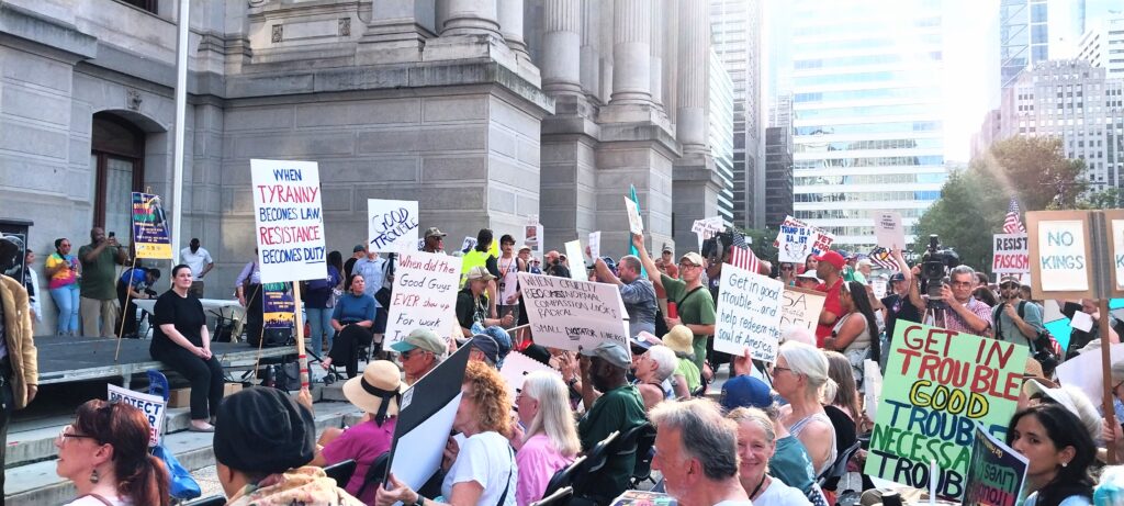 Este 17 de julio de 2025, se están llevando a cabo manifestaciones en Filadelfia y sus suburbios como parte de una jornada nacional de protestas bajo el lema “Good Trouble Lives On”. Estas movilizaciones conmemoran el quinto aniversario luctuoso del congresista y activista por los derechos civiles John Lewis, y buscan denunciar lo que los organizadores consideran retrocesos en derechos civiles bajo la influencia de políticas promovidas por el expresidente Donald Trump. (Foto Leticia Roa Nixon)