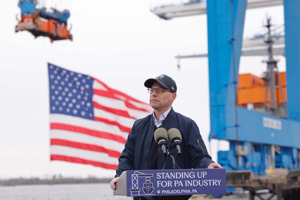 Governor Shapiro was joined by Michael Pearson, Chairman of PhilaPort; Leo Holt, President of Holt Logistics; Representative Ed Neilson; and Daniel Duffy, a crane operator with 27 years of experience at PhilaPort and a member of the International Longshoremen’s Association (ILA) Local 1291. For Duffy, the rising tariffs are not just abstract policies — they directly affect their jobs and their families.