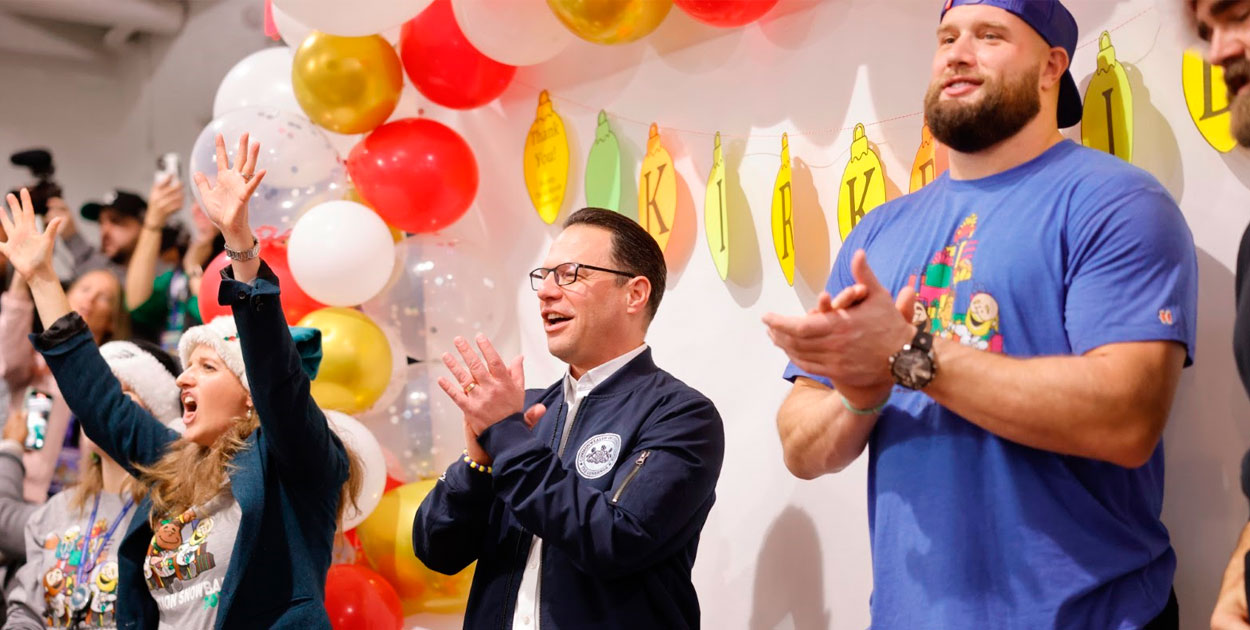 Governor Josh Shapiro joined current and former Eagles offensive linemen Jason Kelce, Lane Johnson, and Jordan Mailata to celebrate a holiday giving initiative that is delivering gifts to over 200,000 children in Philadelphia