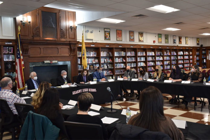 La superintendente adjunta de Kearny, Flora Encarnacao, el presidente de la Asociación de Educación de Nueva Jersey (NJEA, por sus siglas en inglés), Sean Spiller, los maestros y los padres de los estudiantes de Kearny asistieron a la mesa redonda en la Escuela Secundaria de Kearny.
