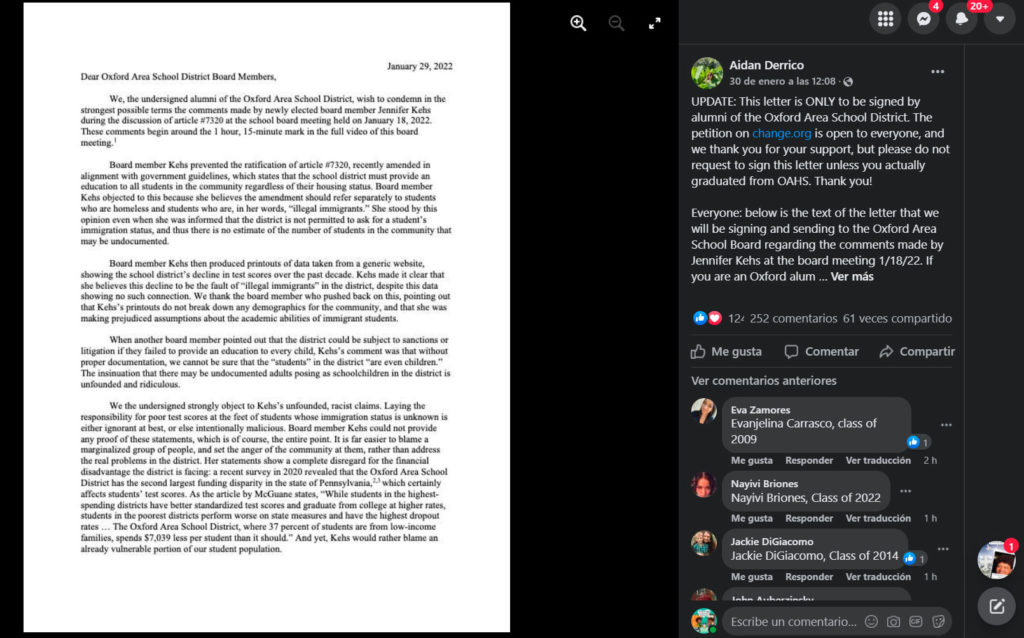 El pasado 18 de enero se llevó a cabo la Junta Escolar del Área de Oxford, en la cual Jennifer Kehs, hizo declaraciones de carácter racista y xenofóbico. La académica pidió una política del distrito sobre estudiantes sin hogar, usando la frase “inmigrantes ilegales”, e hizo responsables a “esas personas” de la disminución de los puntajes de las pruebas.