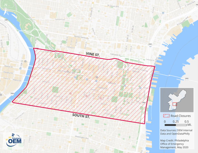 Cierre de vías en el centro de Filadelfia: para facilitar la limpieza y más respuestas de emergencia si es necesario, la Ciudad ha cerrado todas las calles en el centro de la ciudad. El área de cierre se extiende desde la calle Vine hasta la calle South, desde el río Delaware hasta el río Schuylkill. El cierre entró en vigencia al mediodía de hoy, domingo 31 de mayo y continúa hasta nuevo aviso. El acceso por SEPTA también estará restringido. Los residentes y operadores de negocios en el centro de la ciudad tendrán acceso permitido. (El mapa del área de cierre se incluye a continuación).