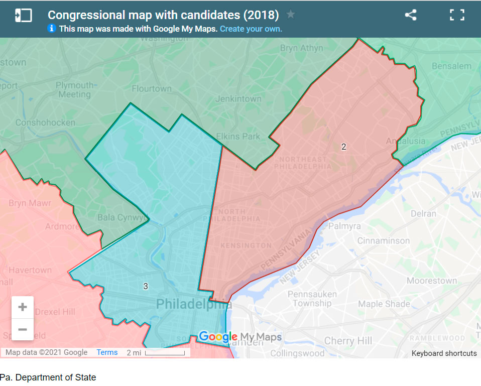 The two maps included here as Exhibit 1 and Exhibit 2 are zoomed in to show the US Congressional districts of Philadelphia. Exhibit 1 is the current map of district boundaries, established by the PA Supreme Court in 2018 following the legal battle over the gerrymandered maps produced in 2011. Exhibit 2 is the map put forward by the PA House Republicans. Nineteen “citizen maps” were submitted by the public (either individuals or groups/organizations), and the one selected was created by the former Lehigh County Republican Commissioner, Amanda Holt. Ms. Holt was active a decade ago in advocacy efforts to create fairer districts, after her realization that voters in her own county were unfairly divided.