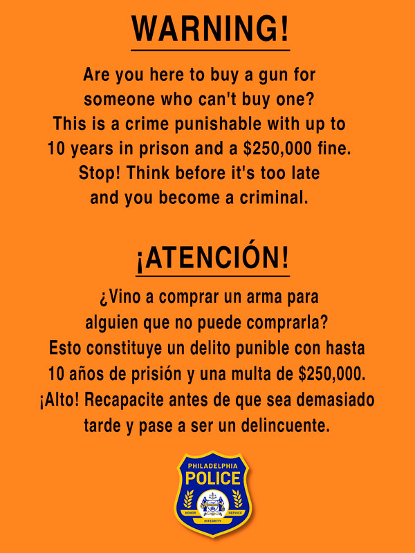 City-Provided Signage: The Philadelphia Police Department will provide these warning signs free of charge to all licensed firearms dealers.  There are seven licensed firearms dealers in Philadelphia, police said.