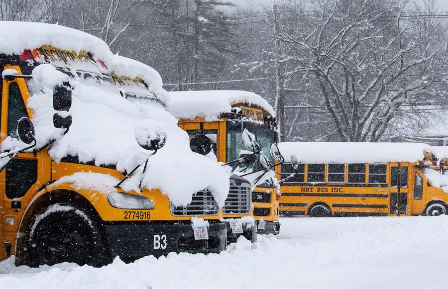 Vista de varios autobuses escolares cubiertos de nieve en Wilmington, Massachusetts, EEUU, hoy 02 Febrero 2021. (Foto: EFE/EPA/CJ GUNTHER)