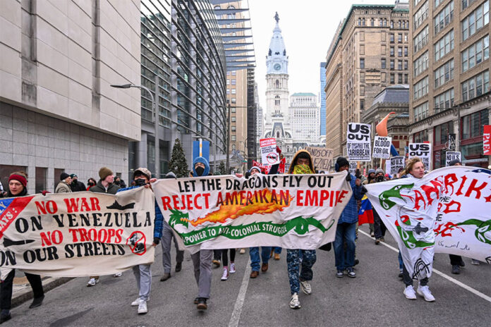Manifestantes marchan por las calles con pancartas contra la política exterior de Estados Unidos y en rechazo al “imperialismo estadounidense”, en un contexto de creciente descontento social durante el segundo mandato del presidente Donald Trump. (Foto: RR. SS.)