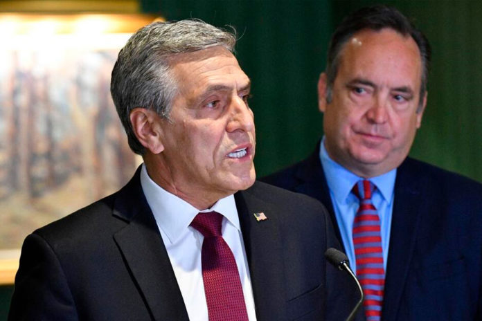 Lou Barletta speaks at a news conference where he accepted the endorsement of a rival in Pennsylvania's crowded Republican primary for governor, Jake Corman, right, May 12, 2022, in Harrisburg, Pa. Corman's endorsement comes as GOP leaders warn that leading Republican primary candidate Doug Mastriano is too far right to win in a general election. (Photo: AP/Marc Levy)