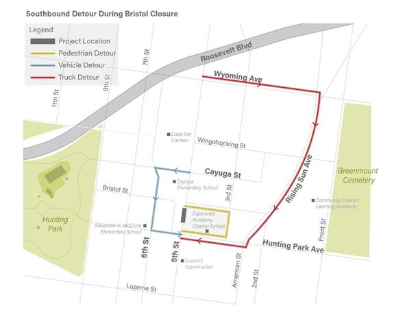 • Desvío para vehículos de pasajeros de 5th Street en dirección sur cuando Bristol Street está cerrada: a la derecha en Cayuga Street, a la izquierda en 6th Street ya la izquierda en Hunting Park Avenue;