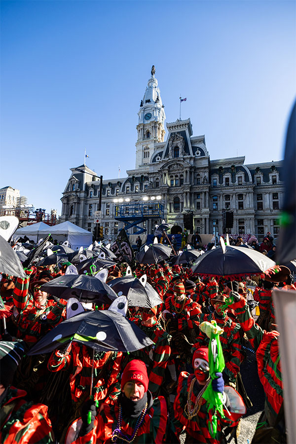 One of this country’s most distinctive and acclaimed folk celebrations, rooted in the traditions brought here by immigrants, where costumed residents blend tradition and friendly competition with local pride. Fierce winds forced organizers to reschedule the String Band Division competition for the first time in the parade’s long history, but the spirit of Philadelphia Mummery was undiminished. While bands marched and performed, thousands of brave souls crowded around City Hall with unfazed enthusiasm, as they stood up to the wind gusts along Broad Street.