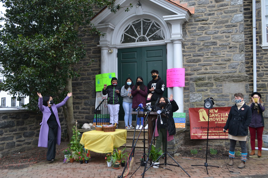 Los codirectores del Movimiento Nuevo Santuario (NSM) Peter Pedemonti y Blanca Pacheco, la Rev. Renee McKenzie de la iglesia The Advocate, el abogado de inmigración David Bennion, los pastores John Bergen y Cate Michelle Desjardins de la iglesia Menonita de Germantown, la asambleísta por acumulación Helen Gym y representantes de la oficina del congresista Dwight Evans, la intérprete Gina Engst y miembros de diversas congregaciones.