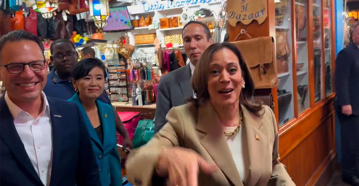 Harris salió de su participación en reunión de votantes estadounidenses asiáticos e isleños del Pacífico en el Centro de Convenciones de Pensilvania, (APIA Vote) y se detuvo para hacer una breve visita al Little Thai Market, acompañada por Shapiro.