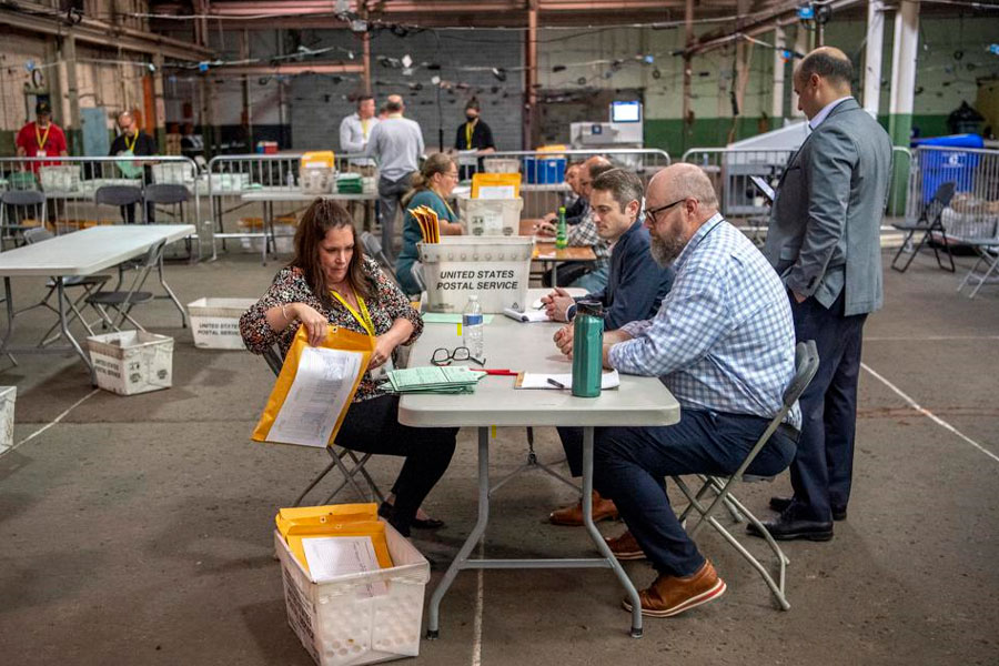 Allegheny County elections workers review provisional ballots with authorized representatives from Dave McCormick and Dr. Mehmet Oz's campaigns, Monday, May 23, 2022, on the North Side neighborhood of Pittsburgh, Pa. (Photo: AP/Alexandra Wimley/Pittsburgh Post-Gazette)