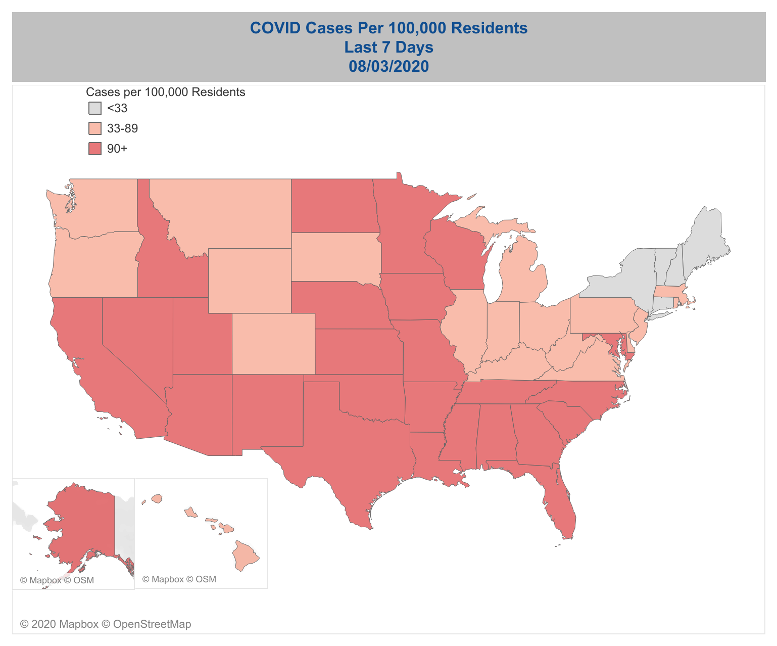 Recomendaciones de Viaje: El Departamento de Salud Pública recomienda que todos los habitantes de Filadelfia sigan la guía de viaje que se encuentra en el sitio web COVID-19 de la Ciudad. Los residentes de Filadelfia no deben viajar a ninguno de los estados de color rojo en el mapa, y deben permanecer en cuarentena durante 14 días si han viajado desde cualquiera de estas áreas. El Departamento de Salud Pública también señaló que la disminución de casos nuevos esta semana puede deberse en parte a que menos personas informaron viajes recientes, ya sea a la costa o a otros estados, durante las investigaciones de casos.