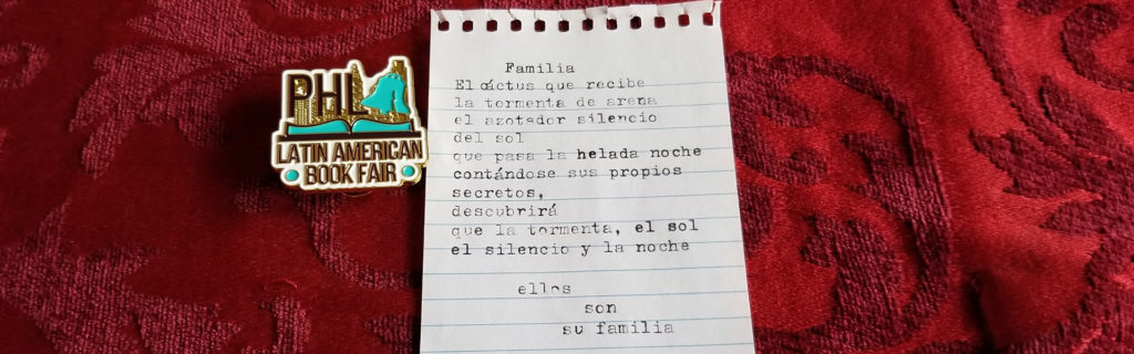 Después de caminar unos pasos, pude observar como la autora española, Concha Alborg estaba en la mesa del escritor Carlos José Pérez Sámano comprando un libro; él muy amable se lo firmó con una dedicatoria. La mesa del escritor mexicano tenía algo de particular, junto a sus libros a la venta, era una máquina mecánica de escribir y una tableta de papel. En ese momento recordé que Selekha me dijo que, si le daba una palabra a Carlos, él podría escribirme un poema. Así que me lancé al desafío y le di al autor la palabra “familia”. Durante unos minutos, el poeta estaba muy concentrado y solo se escuchaba el sonido fuerte del “click-clak” de las teclas. Las palabras parecían fluirle de manera muy natural; al cabo de un corto tiempo, me entregó el poema firmado.