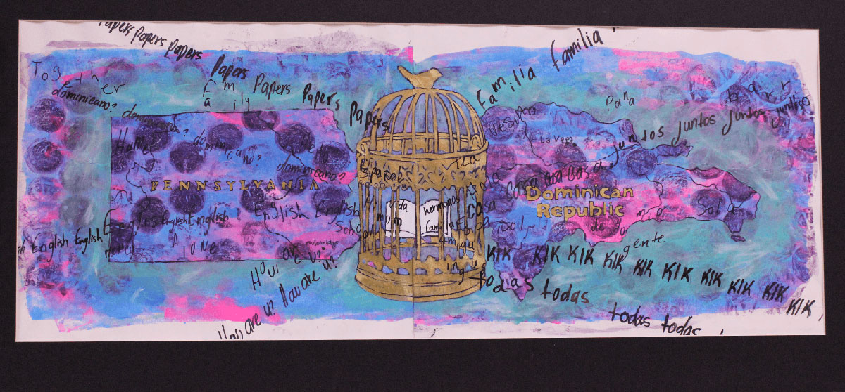 The students’ art pieces show a variety of symbols to express their feelings surrounding their origins and their current home here in Philadelphia. One such student showed her home country, the Dominican Republic, on one-half of her painting with words that she would hear on the island. The other half of her painting showed the state of Pennsylvania and words associated with her home here. The dissonance between these two homes creates its own set of inquiry. It is this inquiry around origins that Frank explores.