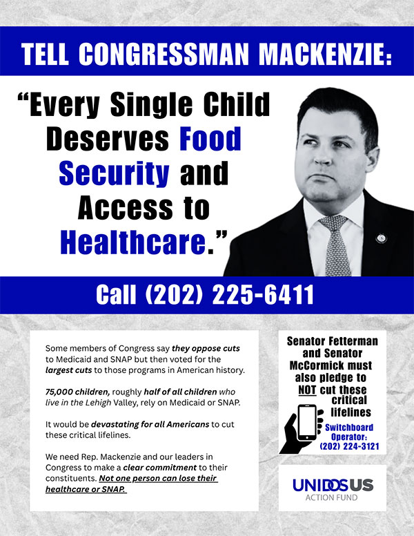 Approximately 31,000 children live in the city, and 85% of them rely on Medicaid for health care or SNAP for food. Nationwide, 11.7 million Latino children depend on these programs—nearly 3 out of every 5 Hispanic children. These figures underscore the urgent need to protect these essential services to maintain the stability of families in Allentown and the Lehigh Valley.