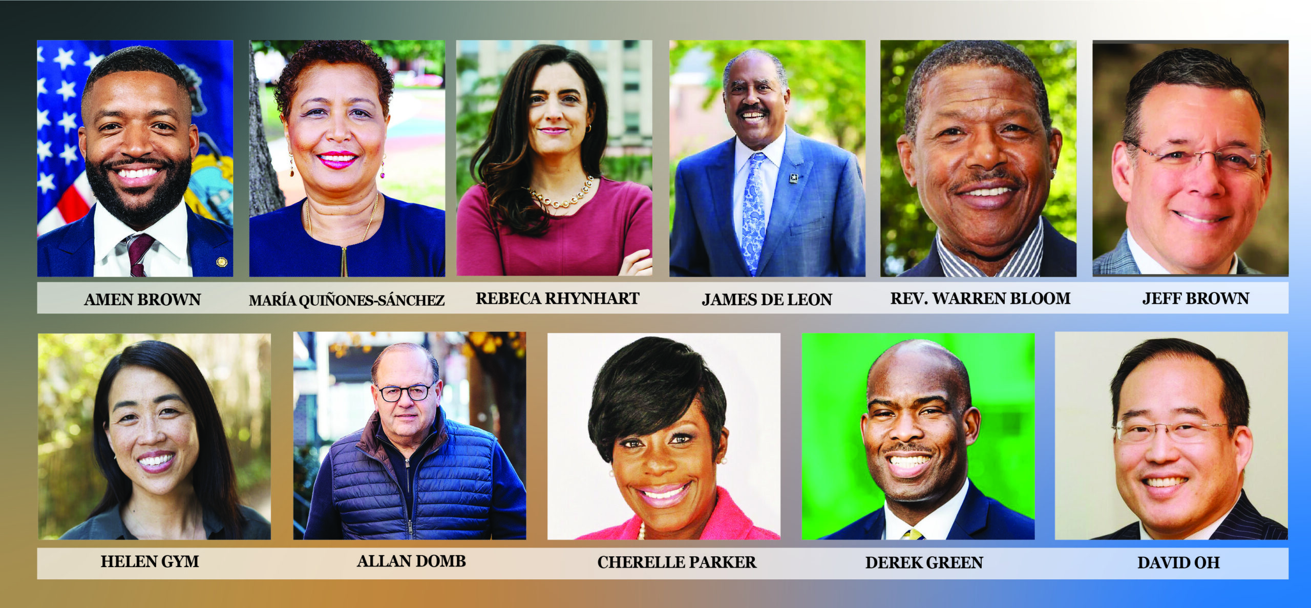 Los candidatos demócratas incluyen al representante estatal Amen Brown y a los exconcejales de la ciudad Allan Domb, Derek Green, Helen Gym, Maria Quiñones-Sánchez y Cherelle Parker; el exjuez municipal James DeLeon; la excontralora de la ciudad Rebecca Rhynhart; el empresario Jeff Brown; y el pastor Warren Bloom, mientras el único republicano en postularse es el también exconcejal At-Large City David Oh.