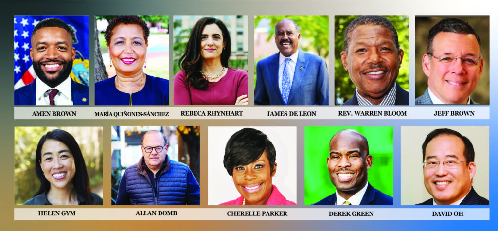 Los candidatos demócratas incluyen al representante estatal Amen Brown y a los exconcejales de la ciudad Allan Domb, Derek Green, Helen Gym, Maria Quiñones-Sánchez y Cherelle Parker; el exjuez municipal James DeLeon; la excontralora de la ciudad Rebecca Rhynhart; el empresario Jeff Brown; y el pastor Warren Bloom, mientras el único republicano en postularse es el también exconcejal At-Large City David Oh.