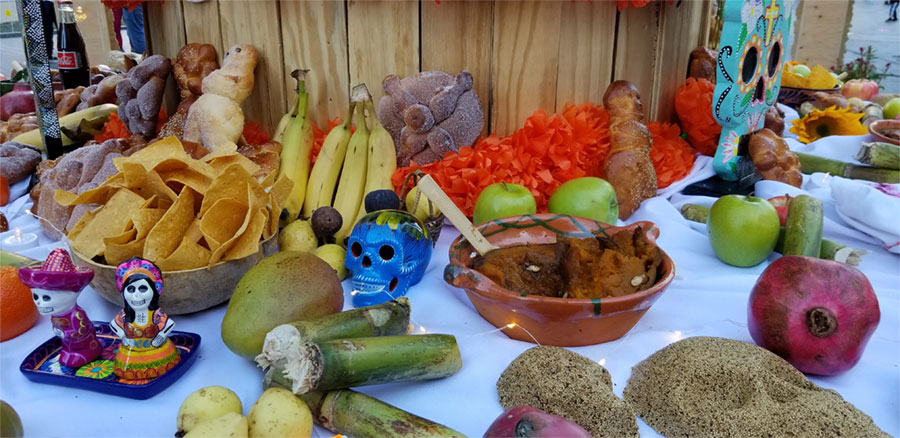 El incienso aromatiza el altar comunitario en el centro de Love Park. El humo, como en una fogata, atrae a los transeúntes que se desvían de su rutina habitual para observarlo. Al ingresar al ambiente de ritos ceremoniales, se divisan alfombras creadas de papel picado con un vibrante color anaranjado. Las velas blancas y las flores cempasúchil o marigolds, embellecen el camino hacía el altar de ofrendas. Cada uno de los tres pisos expone elementos de arte folklórico mexicano; además del pan de muerto, frutas y hortalizas, entre otros componentes simbólicos para rendir un homenaje a los familiares, amigos y vecinos que partieron de este mundo terrenal.